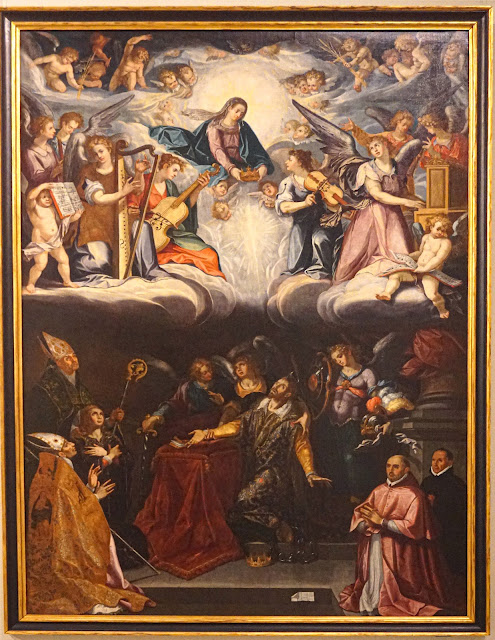 de rojo y azul, rodeada de ángeles músicos, que tienden hacia san Hermenegildo la corona